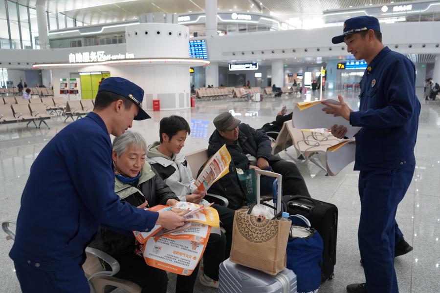 铁路是众多市民旅客感受安全祥和春节的“第一站”,本市各大交通枢纽都能看到消防人员驻防巡查的身影。在新建成的上海松江站候车厅内,松江消防宣传人员穿梭在来往旅客中,积极发放图文并茂的宣传手册,耐心讲解火灾预防、疏散逃生、乘车防范要点等消防安全知识,提醒旅客不要在车厢内吸烟。