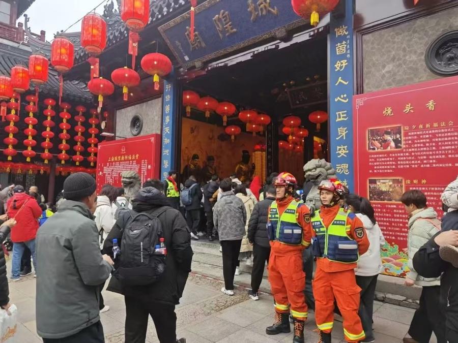 除夕夜、年初五,本市各宗教寺庙场所人员密集,祈福活动持续到凌晨,消防指战员在焚香点、寺庙大殿等重点区域全天候值班驻守,随时响应。