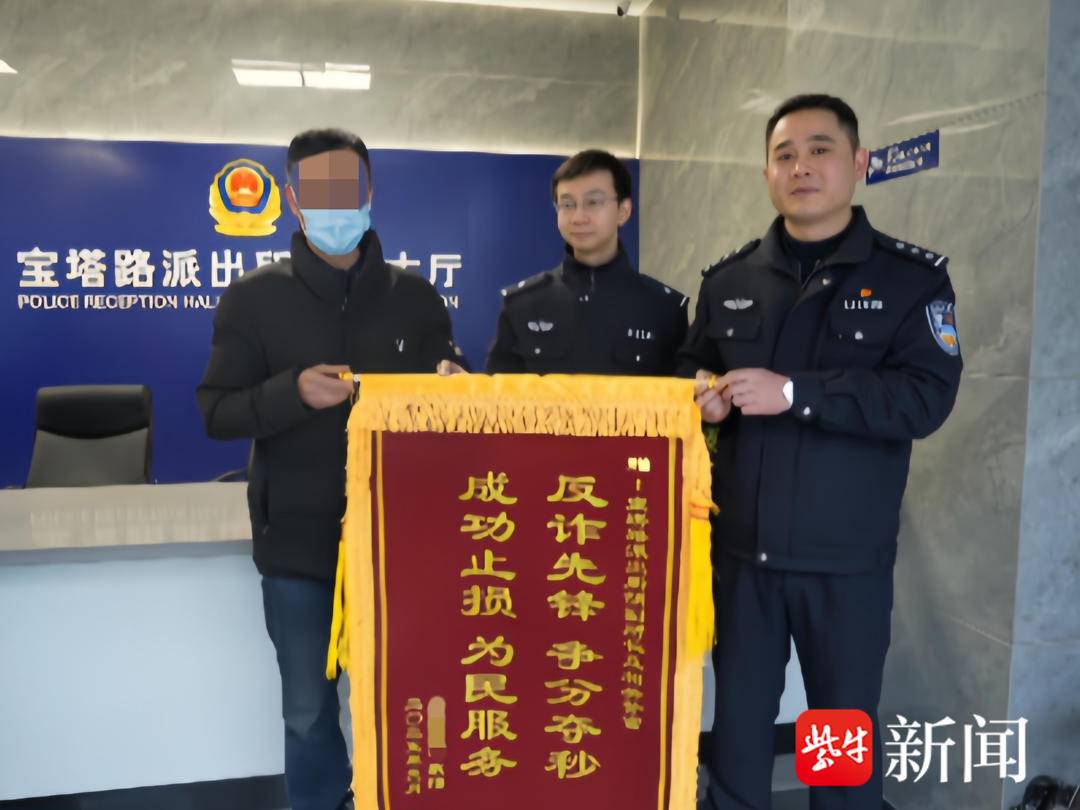 过年期间,大梦醒来并感激不尽的徐先生,带着早已制作好的锦旗来到宝塔路派出所,将锦旗送到胡方明和华蔚杰手中,感谢民警为其挽回了养老钱。
